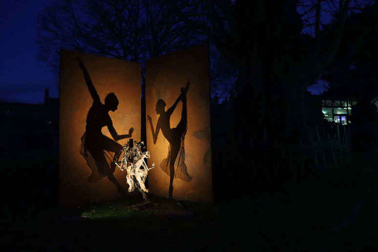 At night, the sculptures come alive, standing illuminated in the stark contrast of a garden, where their shadows dance across the landscape and their presence shifts from static form to living narrative.